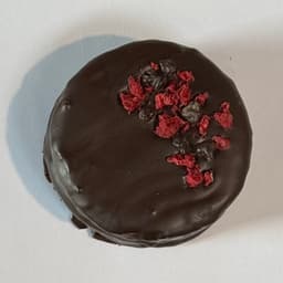 Tapas de brownie, Relleno de Crema Bariloche y centro de Dulce de Frambuesa. Baño de chocolate semiamargo. Topping: Frambuesa liofilizada y nibs de cacao