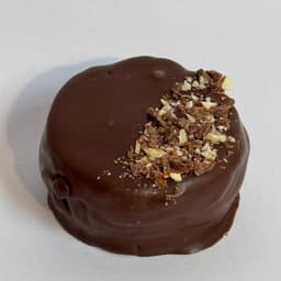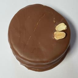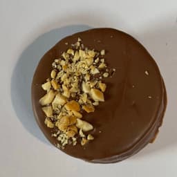 Masa sable con Mani, Relleno con Ganache de Chocolate y Mani. Baño de chocolate con leche. Topping: Mani picado