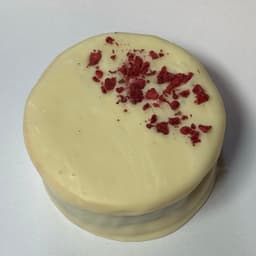 Masa sablé de vainilla, relleno de dulce de leche y mermelada de frambuesa. Baño de chocolate blanco. Topping: Frambuesa liofilizada