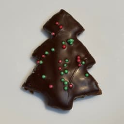 Masa de cacao, relleno de crema bariloche y centro de frambuesa, baño de chocolate semiamargo 80% - Topping: sprinkles navideños