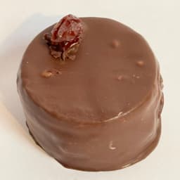 Masa de cacao, relleno de ganache de chocolate y pasas maceradas en rhum. Baño de chocolate semiamargo. Topping: pasa de uva al rhum