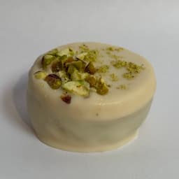 Masa sable, relleno con ganache de pistacho y centro de frambuesa con baño de chocolate blanco. Topping: pistachos picados