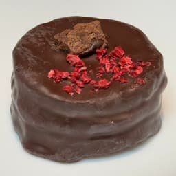 Masa de cacao, relleno de dulce de leche y mermelada de frambuesa. Baño de chocolate semiamargo. Topping: Frambuesa liofilizada