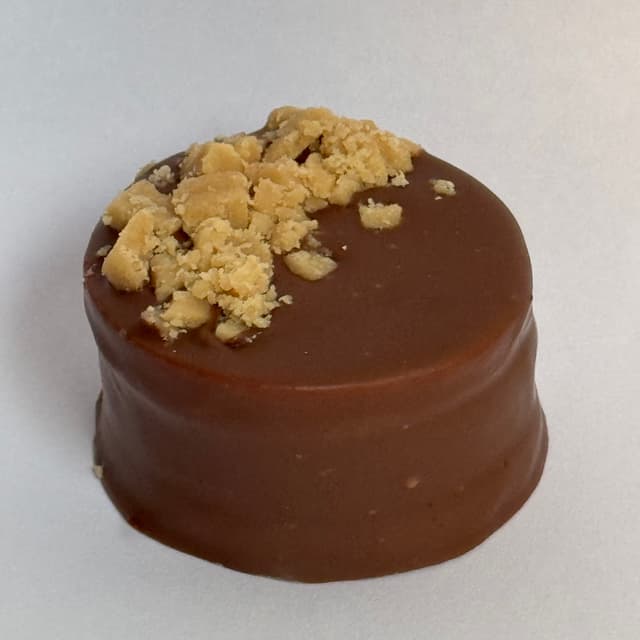 Masa sable, relleno con dulce de leche y turrón casero de maní (tipo mantecol). Baño de chocolate con leche. Topping: turrón de maní